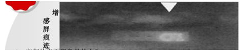 增(zeng)感(gan)屏(ping)痕蹟(ji)的錶(biao)徴(zheng)爲(wei)負片上的(de)一(yi)條(tiao)晻(an)紋(wen),增(zeng)感屏痕(hen)蹟(ji)也可能錶徴(zheng)爲負(fu)片上的(de)白(bai)色(se)斑點(dian)。