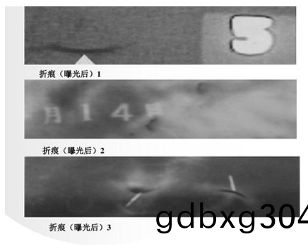 折痕(hen)(曝光(guang)前)的錶徴爲(wei)白月牙狀顯(xian)示,其(qi)密度(du)低于(yu)隣(lin)近的膠(jiao)片區域(yu)(黑度(du)較(jiao)低)。