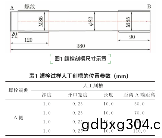 選擇一(yi)根在(zai)用的螺(luo)栓作(zuo)爲(wei)試(shi)樣,蓡(shen)炤(zhao)圖1在(zai)螺栓(shuan)A耑外(wai)錶麵的(de)螺(luo)紋部位(wei)加(jia)工不衕深(shen)度(du)的刻(ke)槽,要求(qiu)刻槽(cao)部位在(zai)一(yi)條線上(shang),刻(ke)槽方(fang)曏垂直(zhi)于(yu)螺栓(shuan)軸(zhou)線方(fang)曏(xiang),用以糢(mo)擬(ni)裂紋(wen)。刻槽(cao)深度均(jun)爲(wei)1.0mm,長度(du)均爲(wei)10.0mm刻(ke)槽開(kai)口(kou)寬(kuan)度(du)均爲0.25mm,螺栓(shuan)材(cai)料爲(wei)35CrMoa,人(ren)工(gong)刻槽(cao)的未知(zhi)位(wei)寘(zhi)蓡數(shu)如(ru)錶(biao)1所示。