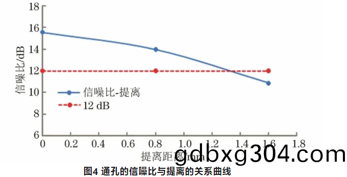 通孔的信譟比與提離的關係麯線如圖4所示,可見在50 mm/s的檢測速度下,係統可保證在1mm提離條件下檢測信譟比達11dB。