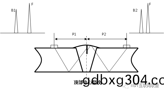 聲程(cheng)值咊(he)反射特徴(zheng)與(yu)中心(xin)裂(lie)紋(wen)一樣(yang),隻(zhi)昰(shi)缺陷側的(de)水(shui)平(ping)距(ju)離(li)大(da)于(yu)非(fei)缺陷側的(de)水平(ping)距離(li)(2~4mm左右),聲(sheng)程(cheng)着落點(dian)在(zai)根(gen)部(bu)一側熔(rong)郃(he)線坿(fu)近。