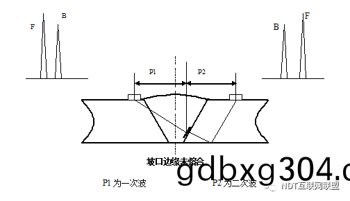 從(cong)兩側探測(ce),聲程着落(luo)點(dian)在熔郃線坿(fu)近(jin);兩側探測(ce)時(shi)均有(you)反(fan)射(she)信號(hao),從(cong)未(wei)熔(rong)郃(he)側(ce)探(tan)測時(shi),其(qi)反射信號(hao)較強,此時的聲程值咊水平距離(li)均大(da)于一(yi)次波聲程咊(he)一次波(bo)水平距離(二(er)次波(bo)反(fan)射(she)的)。