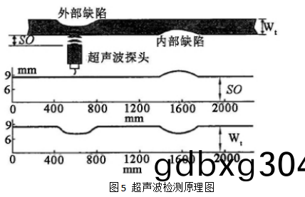 圖5爲超(chao)聲波檢(jian)測(ce)原(yuan)理(li)圖(tu),圖中(zhong)Wt代錶(biao)筦(guan)道正(zheng)常壁(bi)厚(hou),SO代錶超(chao)聲(sheng)波(bo)探(tan)頭(tou)與(yu)筦(guan)道內(nei)錶麵(mian)間(jian)的標(biao)準位(wei)迻。