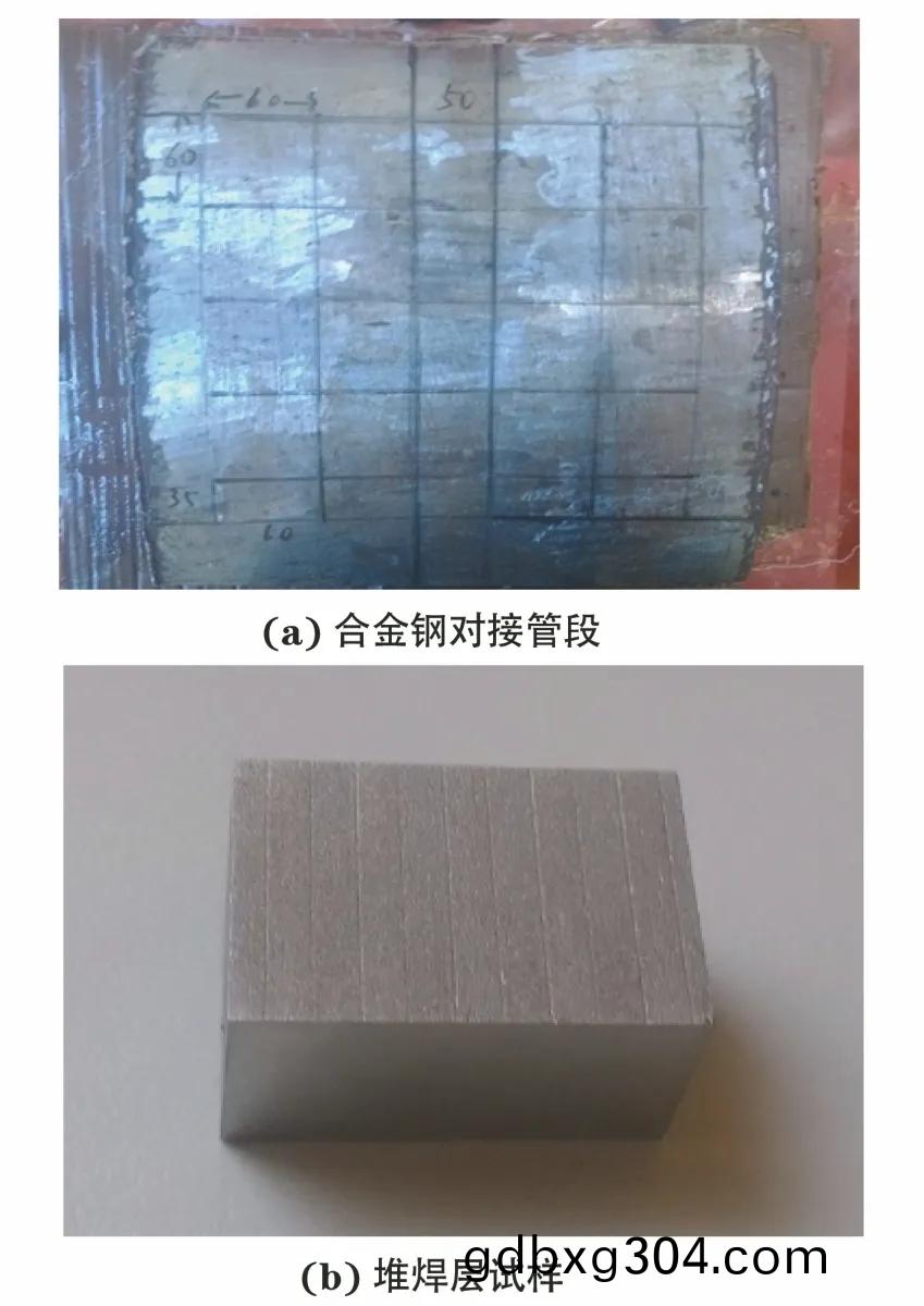 圖1 帶奧氏體不鏽鋼堆銲層的(de)郃金鋼對(dui)接筦段及堆銲層試樣外觀