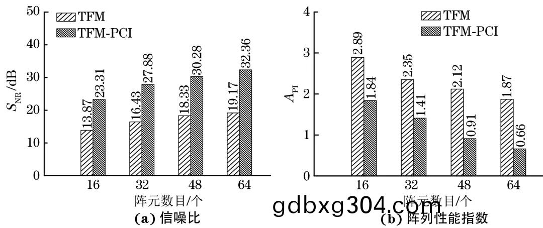 圖5 不衕陣(zhen)元數目下應用PCI灋前后TFM成像的(de)信(xin)譟比咊(he)陣列性能指數